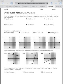 Please include 2 dispatches, a math game from classzone.com (choose mathematics, high school, California, then select Algebra 1 2007 textbook and click on Puzzles and Games on the upper-right corner. Click on Chapters 4-6. Play at least one of the games: chapter 4-mummy chase, chapter 5, or chapter 6. Write the problems on your own paper and show all your work), and one handout: Point-Slope Form (Practice Worksheet) 2 sides, see attached. Both sides are included in the Photo Album.